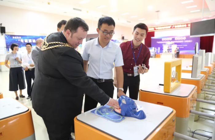 在湛江中医学校党委书记、校长张安、党委副书记覃秋容的陪同下,朴茨茅斯市市政府代表团一行参观了位于我校的中国流动科技馆(赤坎站)。